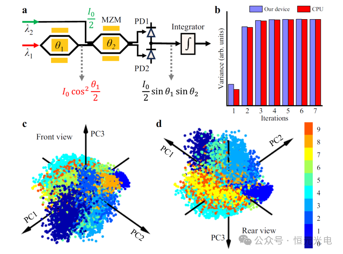 該團隊通過利用主成分分析對大規(guī)模手寫數(shù)字進行聚類,展示了該團隊研發(fā)設(shè)備在無監(jiān)督學(xué)習(xí)AI任務(wù)中的潛力,主成分分析是最常用的無監(jiān)督學(xué)習(xí)模型之一。主成分分析通過將高維數(shù)據(jù)幾何投影到有限數(shù)量的主成分(PC)上,以獲得數(shù)據(jù)的最佳摘要,從而簡化了高維數(shù)據(jù)。該團對發(fā)研發(fā)設(shè)備的收斂速度與CPU的收斂速度相當(dāng)(見圖5b)。