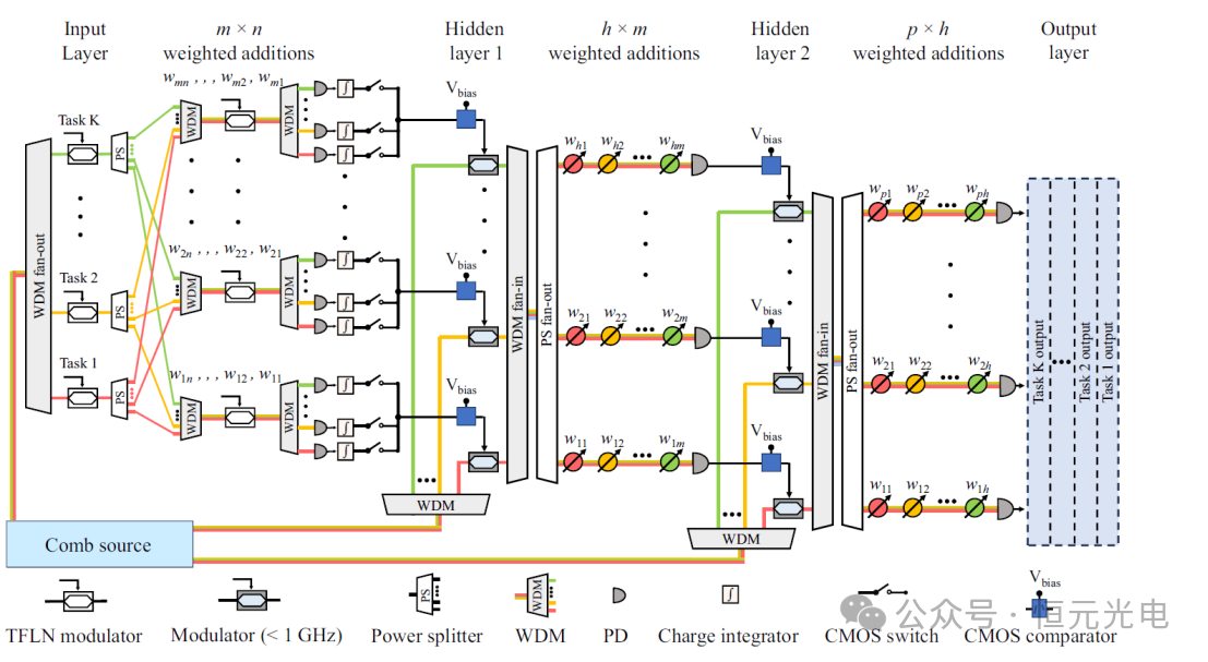 此外,該團隊為了展示解決方案的可擴展性,提出了一種端到端的光子神經(jīng)網(wǎng)絡(luò),該網(wǎng)絡(luò)結(jié)合了TDM和WDM方法的優(yōu)點,如圖6所示。該網(wǎng)絡(luò)能夠同時執(zhí)行多個AI任務(wù),從輸入層到輸出層,延遲為納秒,所有這些都不依賴于數(shù)字處理器的幫助。