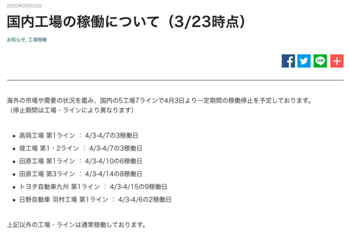 其中的高岡工廠在3月20日-23日期間,接連出現(xiàn)兩名新冠肺炎感染者,這也迫使豐田從3月23日-25日暫時關(guān)閉了兩名感染者工作的同一條生產(chǎn)線,這也是豐田在日本國內(nèi)首次關(guān)閉生產(chǎn)線。