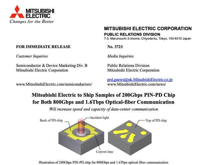 三菱電機也在周二宣布,從今年10月開始,將開始出貨用于800Gbps和1.6Tbps光纖通信的200Gbps PIN-PD芯片樣品。也就是說,配備4個新PD芯片的光收發(fā)器可實現(xiàn)800Gbps通信,使用8個芯片則能讓通信容量再翻一倍。