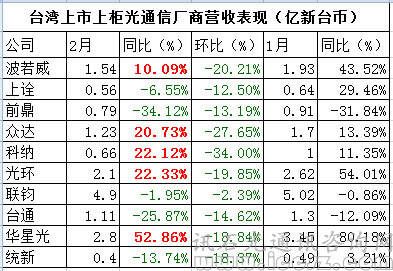 都是無源廠家的科納與波若威,2月營收同比均漲。事實上波若威去年因大形勢不樂觀,全年也過得有驚無險,今年倒“步步為營”起來。而WSS廠商科納早就盛傳今年電信單穩(wěn)健,全年獲利可望增長35%,2月營收同比繼續(xù)增長也就不奇怪了。