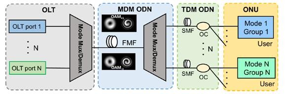 圖2OAM空分復(fù)用和時分復(fù)用結(jié)合的混合無源光網(wǎng)絡(luò)