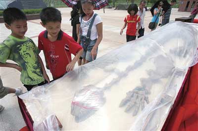 云南小朋友觀看將被運(yùn)走的“雙脊龍”化石。