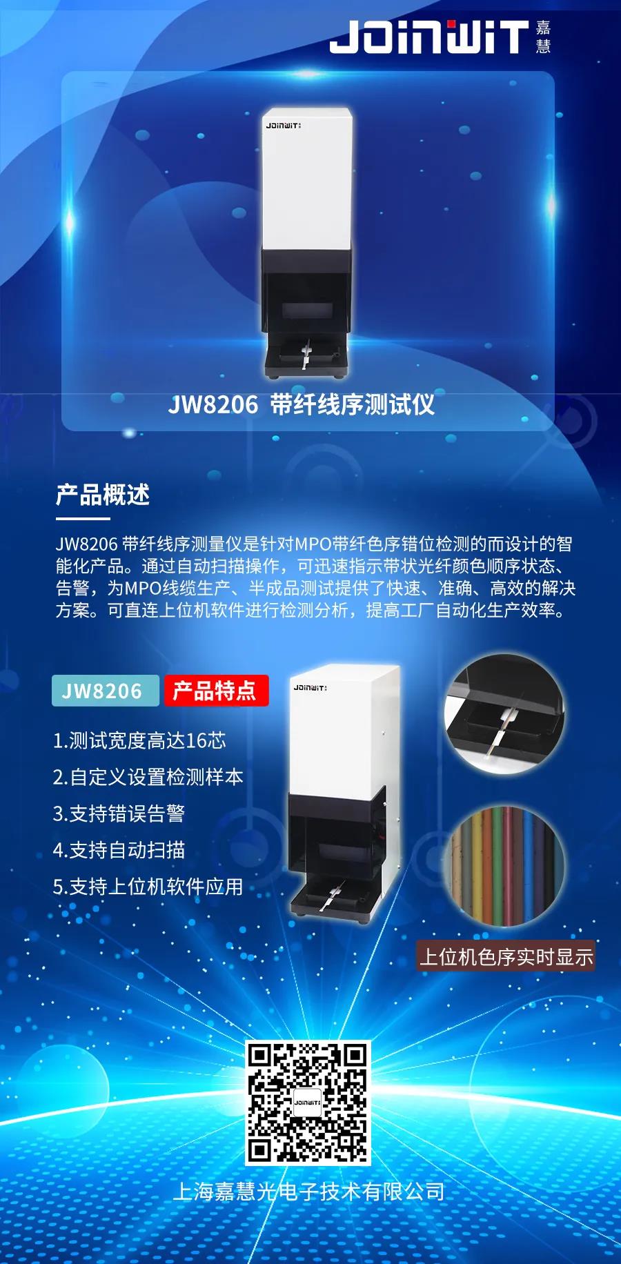摘要:上海嘉慧光電子技術(shù)有限公司推出JW8206帶纖線序測量儀,面向MPO帶纖色序錯(cuò)位檢測。
