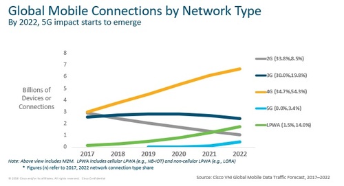 思科的新預測還顯示,到2022年,5G連接僅占全球蜂窩網絡連接總量的3.4%。相比之下,4G占54%,3G占20%,2G占8%,LPWA(低功率廣域)占14%,LPWA網絡包括蜂窩(如窄帶物聯(lián)網)和非蜂窩技術(如LoRA)。思科高級分析師Shruti Jain表示,盡管4G流量將繼續(xù)增長,并在2022年以較大優(yōu)勢主導移動通信領域,但隨著5G試驗和部署的規(guī)模越來越大,4G將開始進入“穩(wěn)定時代”。