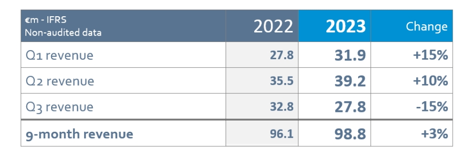 2023年前9個(gè)月,合并收入為9880萬歐元,與去年同期相比增長了3%,這是一個(gè)特別高的比較基數(shù)(增長28%)。按固定匯率計(jì)算,這一時(shí)期的經(jīng)濟(jì)增長率為4%。