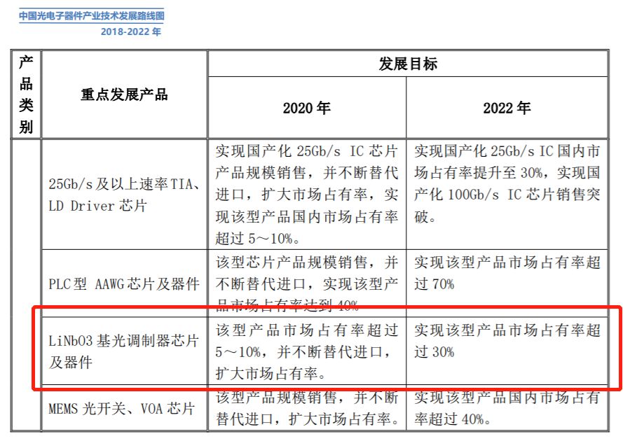 隨著光通信產(chǎn)業(yè)不斷發(fā)展,缺少核心元器件和關(guān)鍵材料這一制約我國(guó)光學(xué)產(chǎn) 業(yè)發(fā)展的瓶頸問(wèn)題日趨嚴(yán)峻。中國(guó)電子元件行業(yè)協(xié)會(huì)《中國(guó)光電子器件產(chǎn)業(yè)技術(shù) 發(fā)展路線圖(2018-2022 年)》指出,目前國(guó)內(nèi)核心的光通信芯片及器件仍然嚴(yán)重依賴進(jìn)口,高端光通信芯片與器件的國(guó)產(chǎn)化率不超過(guò)10%,要求力爭(zhēng)在2020年實(shí)現(xiàn)鈮酸鋰調(diào)制器芯片及器件市場(chǎng)占有率超過(guò)5-10%,并不斷替代進(jìn)口,擴(kuò)大市場(chǎng)占有率,并于2022年實(shí)現(xiàn)市場(chǎng)占有率超過(guò)30%。