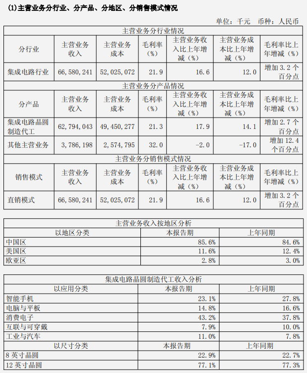 從晶圓尺寸看,12英寸晶圓依然是公司收入的主要來源,收入占比為77.1%,與上年基本持平。8英寸晶圓收入占比為22.9%。