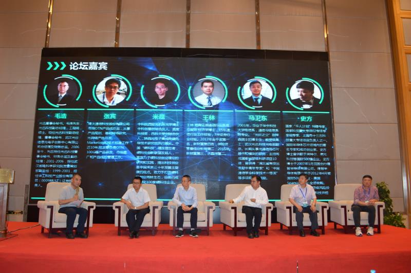 (左起:國家信息光電子創(chuàng)新中心總經(jīng)理毛浩,烽火通信網(wǎng)絡(luò)產(chǎn)線技術(shù)總監(jiān)馬俊,中科創(chuàng)星米磊博士,招商證券首席分析師王林博士,光迅科技光電部副總馬衛(wèi)東,史方博士)