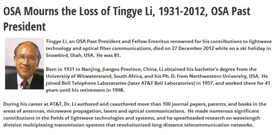 美國(guó)光學(xué)學(xué)會(huì)(OSA)官網(wǎng)顯示,厲先生于2012年12月27日在美國(guó)猶他州雪鳥島滑雪度假時(shí),突發(fā)心臟病去世。厲先生是OSA前任主席,OSA官網(wǎng)已經(jīng)發(fā)布了一篇紀(jì)念文章。中國(guó)工程院官網(wǎng)上“已故外籍院士名單”也在近日更新,厲鼎毅是中國(guó)工程院第十位去世的外籍院士。