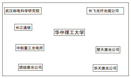 在臺(tái)訪問的最后一天是兩岸學(xué)者的交流。陳良惠團(tuán)長(zhǎng)介紹了我國(guó)信息光電子方面的研發(fā)情況。我介紹武漢地區(qū)光電子(激光、光纖、光電子器件、光通信系統(tǒng)等)的發(fā)展?fàn)顩r。在我的發(fā)言中展示了一幅武漢在國(guó)內(nèi)頗具優(yōu)勢(shì)的光纖光纜、光電子器件、光纖通信系統(tǒng)設(shè)備、高功率激光器及激光加工設(shè)備等光電子研究與生產(chǎn)企業(yè)的示意圖(如圖所示),而且這些企業(yè)均分布在華中理工大學(xué)周圍。當(dāng)時(shí)華中理工大學(xué)在激光器件和激光加工方面有很好的國(guó)內(nèi)優(yōu)勢(shì),有國(guó)內(nèi)最早獲批準(zhǔn)的激光技術(shù)國(guó)家重點(diǎn)實(shí)驗(yàn)室、第一個(gè)國(guó)家激光加工工程中心,有第一批獲準(zhǔn)的“物理電子學(xué)”博士點(diǎn),主要培養(yǎng)激光技術(shù)方面的高級(jí)技術(shù)人才。