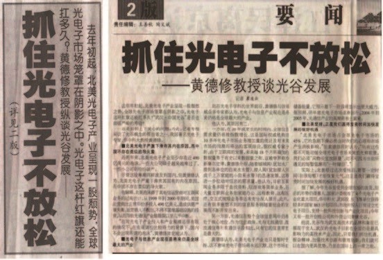 2000 年春節(jié)前夕我應(yīng)邀參加武漢市委和市政府舉辦的一個(gè)專家團(tuán)拜會(huì)。當(dāng)時(shí)的武漢市委羅清泉書記(后來先后為湖北省省長(zhǎng)、湖北省委書記)參加了該會(huì),聽取大家為武漢的發(fā)展建言獻(xiàn)策。我事先并沒準(zhǔn)備發(fā)言,后主持會(huì)議的辜勝阻副市長(zhǎng)點(diǎn)名要我發(fā)言,這使我對(duì)所提建設(shè)“中國(guó)光谷”建議沒有動(dòng)靜而感失望的情緒一下爆發(fā)出來。我簡(jiǎn)要分析了武漢自認(rèn)為的鋼鐵、汽車產(chǎn)業(yè)優(yōu)勢(shì)的某些局限性和光電子產(chǎn)業(yè)的發(fā)展前景。我當(dāng)時(shí)也不知哪來那么大勇氣和霸氣,突然冒出一句:“未來50年,武漢的發(fā)展要靠光電子!”這聽起來很有咄咄逼人之勢(shì)。包括坐在我旁邊的全國(guó)政協(xié)委員許其貞先生在內(nèi)的許多同志都好奇地望著我。我發(fā)言后,羅清泉書記即刻表態(tài):“德修教授,你別著急,我們要將光電子放到重中之重來抓”。后來回想,領(lǐng)導(dǎo)對(duì)我的建議早已放在心上了。