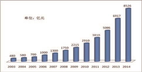 2014 年突破8000 億元而達(dá)8526 億元,如圖3 所示。計(jì)劃到2020 年將突破30000 億元。