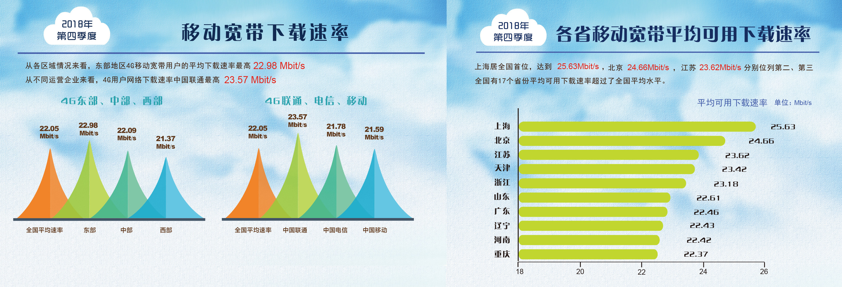 本次報告還發(fā)布了全國各?。▍^(qū)、市)、主要城市和基礎(chǔ)電信企業(yè)寬帶網(wǎng)絡(luò)相關(guān)速率的排名情況。固定寬帶下載速率方面,上海、北京、江蘇率先超過了30Mbps,位列全國前三位,且領(lǐng)先幅度較大;河南、天津緊隨其后。全國主要城市排行榜上,上海、北京、南京、武漢、鄭州位居前五位;各基礎(chǔ)電信企業(yè)中,中國電信最高達(dá)到28.38Mbit/s,其次是中國移動和中國聯(lián)通。4G網(wǎng)絡(luò)下載速率方面,上海、北京、江蘇、天津、浙江的4G網(wǎng)絡(luò)用戶下載速率排在全國省級行政區(qū)前五位;電信運(yùn)營企業(yè)中,中國聯(lián)通的4G網(wǎng)絡(luò)用戶下載速率最高。