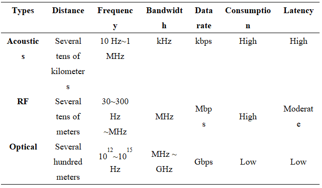 傳統(tǒng)的水下通信方式主要包括水下聲波通信(UAC)、水下射頻(RF)通信和水下無線光通信(UWOC)?;谒侣暡ㄟM(jìn)行通信的UAC技術(shù)一直被認(rèn)為是進(jìn)行長距離數(shù)據(jù)傳輸?shù)淖顚?shí)用的方式,其傳輸距離可達(dá)幾十公里。然而,由于低載波頻率所限制的低調(diào)制帶寬,使得UAC存在著傳輸速率相對(duì)較低的問題,其數(shù)據(jù)速率一般在kbps左右。同時(shí),由于聲波在水下信道中的傳播速度比無線電波低數(shù)個(gè)量級(jí),這導(dǎo)致聲波通信會(huì)存在較大的延遲。