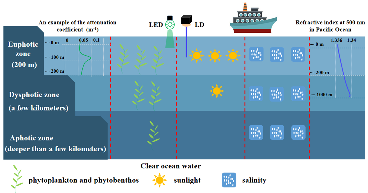 文章首先介紹了水的光學(xué)特性,包括不同水質(zhì)的衰減系數(shù)、海洋環(huán)境根據(jù)垂直深度變化導(dǎo)致的水下光學(xué)特性的變化等。海洋中垂直分層環(huán)境的概要示意圖如圖1所示。