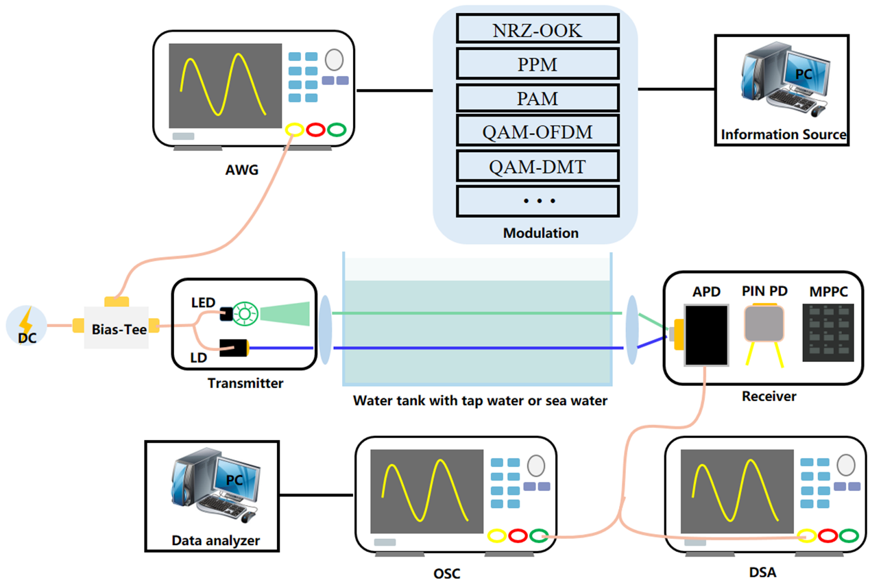 水下通信系統(tǒng)的研究大多是先在實(shí)驗(yàn)室進(jìn)行演示,然后逐步應(yīng)用到實(shí)際水下環(huán)境中。一個(gè)典型的實(shí)驗(yàn)室視線 UWOC系統(tǒng)由三部分組成,如圖4所示,包括發(fā)射單元、水下信道和接收模塊。發(fā)射單元由光源裝置、調(diào)制器、光放大器和光學(xué)透鏡等組成。接收模塊由放大電路、光學(xué)濾波器、光學(xué)透鏡和光電探測器等組成。在發(fā)射端,信息源產(chǎn)生的信息經(jīng)過編碼和調(diào)制處理后,加載到任意信號(hào)發(fā)生器(AWG)上。然后AWG輸出經(jīng)過調(diào)制的交流電信號(hào),通過bias-tee與直流電結(jié)合,驅(qū)動(dòng)光源發(fā)射裝置發(fā)出光載波。調(diào)制后的光信號(hào)經(jīng)發(fā)射透鏡準(zhǔn)直后通過水箱。水箱內(nèi)裝滿自來水,用于模擬水下鏈路,實(shí)驗(yàn)中通常利用反射鏡來實(shí)現(xiàn)遠(yuǎn)距離傳輸。為了模擬真實(shí)的水下環(huán)境,通常會(huì)在水中加入Maalox和海鹽等作為散射劑。在接收端,光信號(hào)將被接收透鏡聚焦,然后被光電探測器捕獲。經(jīng)光電探測器轉(zhuǎn)換后的電信號(hào)將經(jīng)過放大器和低通濾波器進(jìn)行進(jìn)一步優(yōu)化,然后傳送到示波器(OSC)或信號(hào)質(zhì)量分析儀(DSA)進(jìn)行解碼和解調(diào),從而恢復(fù)到原始信號(hào),計(jì)算機(jī)或誤碼率模塊將收集原始信息進(jìn)行進(jìn)一步分析。