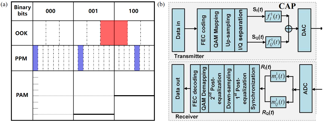 圖6. 不同調(diào)制方式原理示意圖: (a) OOK, PPM, PAM; (b) CAP。(圖(b)引用自文獻(xiàn)“N. Chi, M. Shi, Advanced modulation formats for underwater visible light communications [Invited], Chinese Optics Letters 16 (2018) 120603.”)