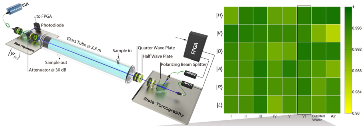 圖7. 單光子量子態(tài)傳輸實(shí)驗(yàn)系統(tǒng)示意圖。(圖引用自文獻(xiàn)“L. Ji, J. Gao, A.-L. Yang, Z. Feng, X.-F. Lin, Z.-G. Li, X.-M. Jin, Towards quantum communications in free-space seawater, Optics Express 25 (2017) 19795-19806.”)