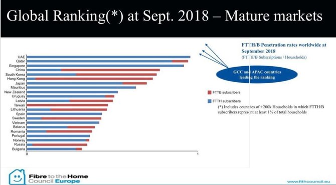 根據FTTH理事會的年度報告,展示了全球光纖網絡滲透率最高的國家。阿聯酋的光纖網絡覆蓋率已經超過了新加坡,中國大陸,韓國,中國香港和日本。