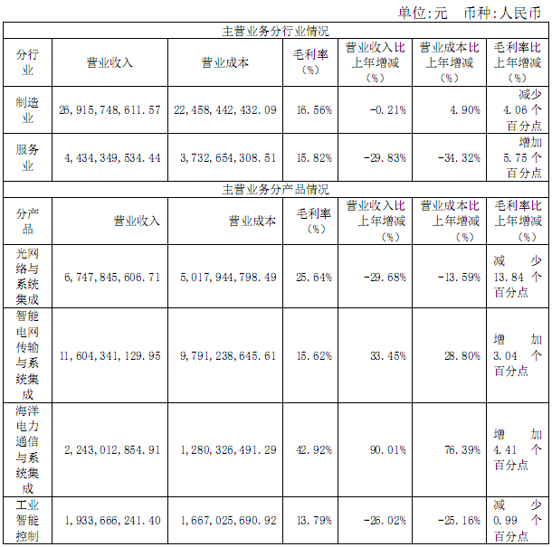 (1) 光網(wǎng)絡(luò)與系統(tǒng)集成業(yè)務(wù)報(bào)告期內(nèi)隨著我國光纖寬帶接入網(wǎng)和 4G移動(dòng)通信基站的建設(shè)基本完成,運(yùn)營商建設(shè)重心逐步轉(zhuǎn)向 5G及光纖網(wǎng)絡(luò)升級,光纖光纜市場面臨短期價(jià)格同比下滑與供需失衡的狀況,受此影響,報(bào)告期公司光網(wǎng)絡(luò)系統(tǒng)與集成業(yè)務(wù)營業(yè)收入同比下降 29.68%,毛利率下降至 25.64%。