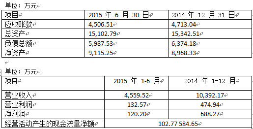 7.財(cái)務(wù)狀況:經(jīng)審計(jì),截止2015年12月31日江蘇奧雷總資產(chǎn)為15,885.83萬元,應(yīng)收賬款為5,110.02萬元,負(fù)債總額為6,310.58萬元,凈資產(chǎn)為9,575.25萬元,2015年1-12月實(shí)現(xiàn)營業(yè)收入10,018.99萬元,營業(yè)利潤為541.45萬元,凈利潤577.18萬元。2015年江蘇奧雷經(jīng)營活動產(chǎn)生的現(xiàn)金流量凈額為596.75萬元。
