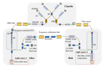 量子密鑰分發(fā)(QKD)則基于量子力學基本原理,結合“一次一密”的加密方式,可實現(xiàn)無條件安全的保密通信。因為其重要的現(xiàn)實意義,QKD一直是過去幾十年來國際學術界的研究熱點。2018年提出的TF-QKD協(xié)議,可以突破QKD成碼率的線性界限,被認為是實現(xiàn)超遠距離光纖QKD的最優(yōu)方案。然而,TF-QKD技術要求相當苛刻,需要兩個遠程獨立激光器的單光子干涉,光源頻率微小的偏差以及光纖鏈路任何波動都會積累相位噪聲而降低單光子干涉的質量。