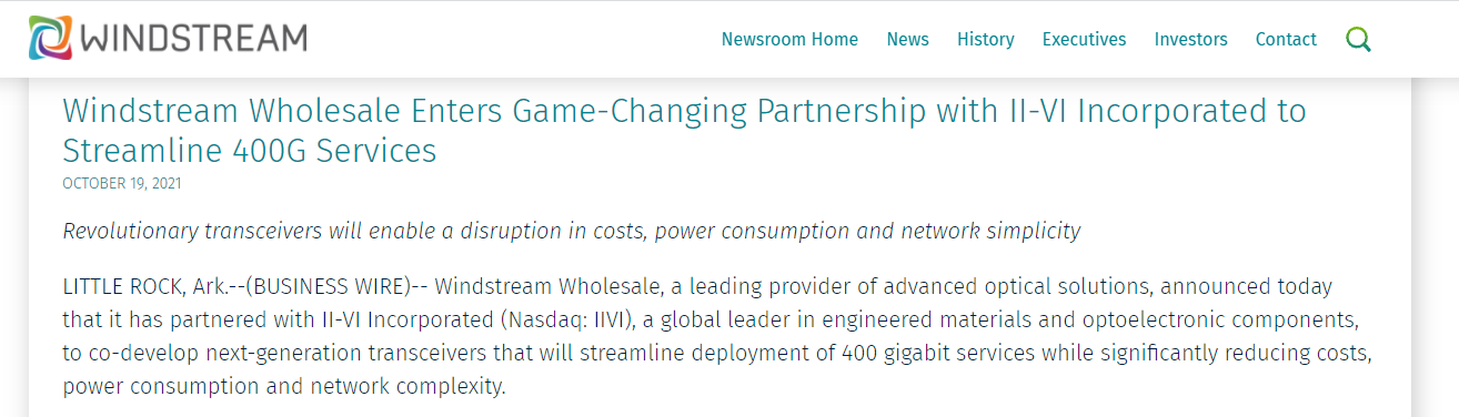 ICC訊 (編譯:Aiur)美國時間10月19日,先進的光學解決方案領(lǐng)導者Windstream Wholesale宣布聯(lián)合全球工程材料和光電器件領(lǐng)導者II-VI高意(II-VI Incorporated)共同開發(fā)下一代收發(fā)器產(chǎn)品,旨在顯著降低成本和功耗并降低網(wǎng)絡復雜度以簡化400G服務部署。