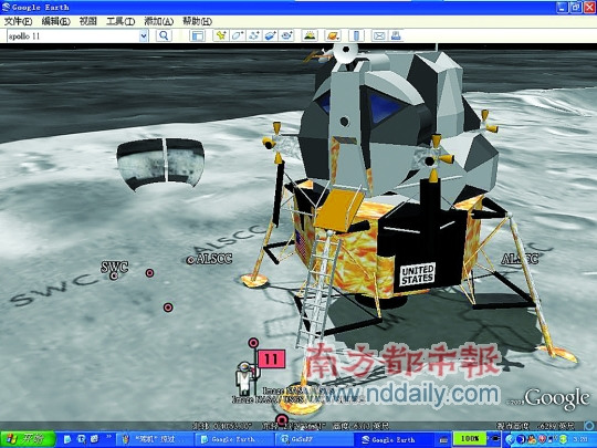 進入月球地圖之后,可以直接在文件欄下面的搜索窗口內輸入“apollo11”,然后按搜索按鈕,系統(tǒng)就會自動將你的視角帶入阿波羅11號登月的方位,你只需控制鼠標的左右鍵即可放大縮小和調節(jié)自己的視角。