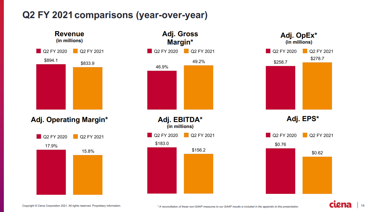 展望2021年第三財季,Ciena預計銷售收入為9.5億美元到9.8億美元之間,毛利率為46%-47%。預計2021財年銷售收入增長0%到3%。