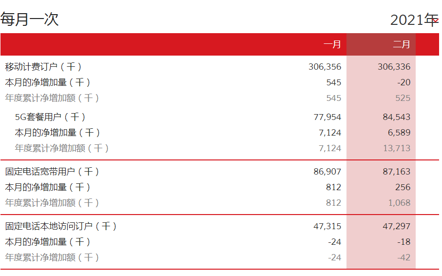 中國(guó)聯(lián)通官網(wǎng)消息,中國(guó)聯(lián)通公布2021年2月份運(yùn)營(yíng)數(shù)據(jù),2月移動(dòng)客戶數(shù)減少2萬(wàn)戶,移動(dòng)客戶總數(shù)為3.06336億戶。2月5G套餐用戶凈增加658.9萬(wàn),共8454.3萬(wàn)戶。