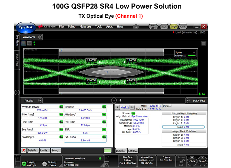 第二代低功耗100G QSFP28 SR4在CDR工作的條件下,其室溫功耗為2W,高溫70℃功耗為2.2W,滿足SFF-8436 V4.8 ?MSA Power level 3中MAX POWER 2.5W功耗檔次。符合IEEE 802.3bm 100GBASE SR4、InfiniBand EDR?、32GFC等協(xié)議標準,同時向下兼容10GE,完全滿足OM3 光纖75米傳輸和OM4光纖100米傳輸應用。實際測試環(huán)境中,依據(jù)更嚴格的誤碼率測試標準(<-15次方), 傳輸100米的OM4光纖沒有發(fā)現(xiàn)任何誤碼。100G QSFP28 SR4采用易飛揚自主研制的透鏡與光引擎技術,集成了收發(fā)雙向8路25Gbps的數(shù)據(jù)通道,支持數(shù)字診斷功能。100G QSFP28 SR4模塊擁有優(yōu)秀的光眼圖、接收靈敏度和電眼抖動性能。