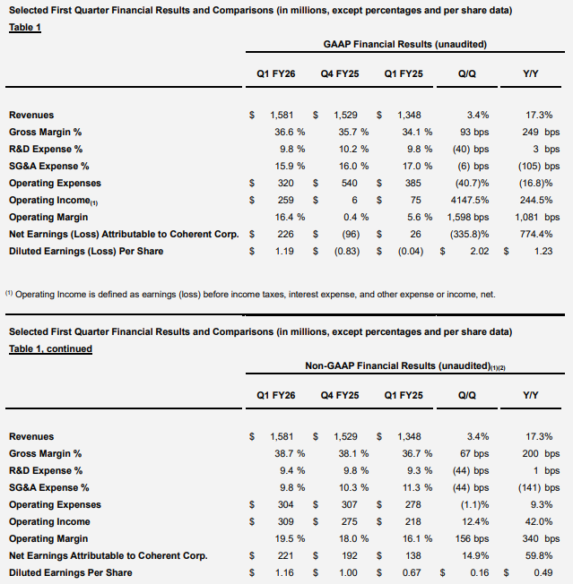 ICC  2025年11月5日,Coherent Corp. 公布其2026財(cái)年第一季度財(cái)務(wù)業(yè)績(jī)。截至2025年9月30日,公司營(yíng)收為15.8億美元,GAAP毛利潤(rùn)率為36.6%,GAAP凈收入為每股攤薄收益1.19美元。在非GAAP基礎(chǔ)上,毛利潤(rùn)率為38.7%,每股攤薄收益為1.16美元。