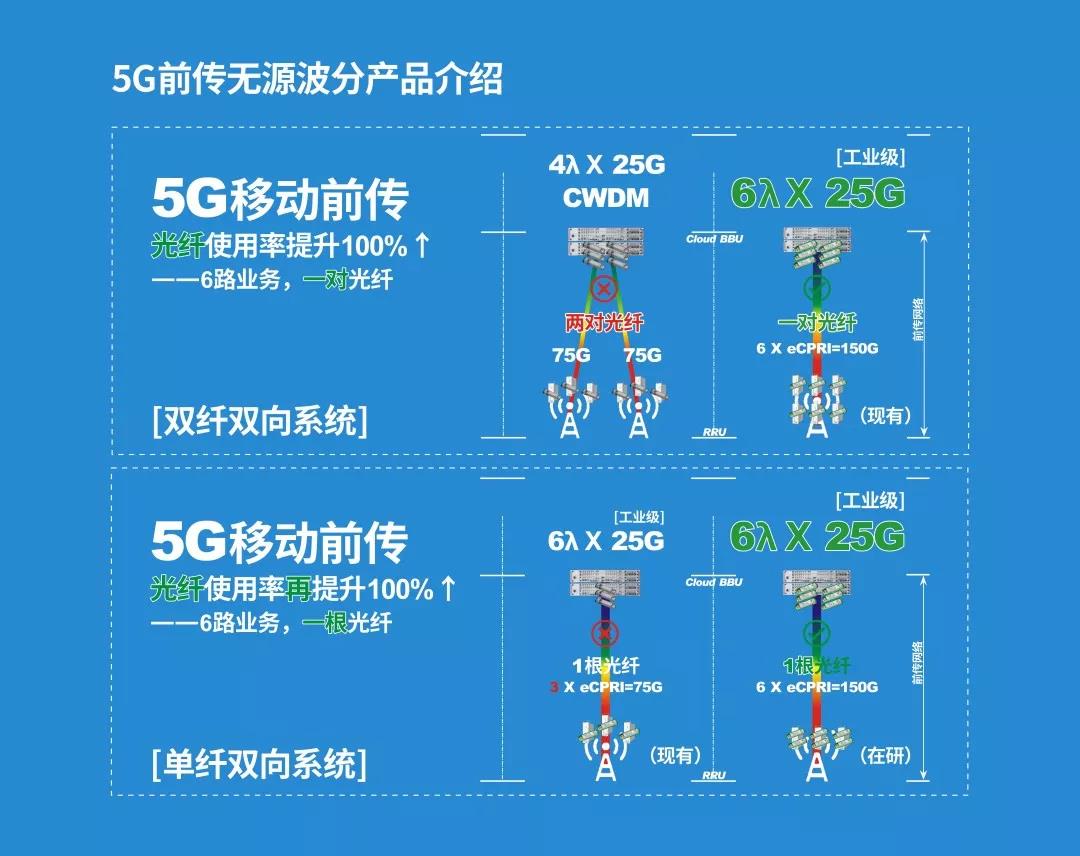 以及完整的無(wú)源波分產(chǎn)品解決方案,希望能夠通過(guò)我們的產(chǎn)品和解決方案, 使得您的目標(biāo)5G前傳網(wǎng)絡(luò)在光纖資源使用率上,能夠得到100%~200%的提升。