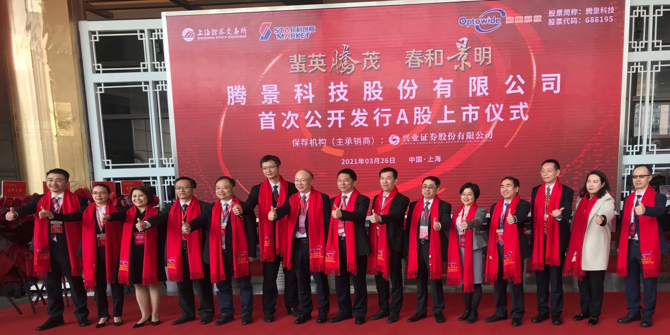 ICC訊 (編輯:Nicole) 3月26日,騰景科技股份有限公司(以下簡稱“騰景科技”)正式在上海證券交易所科創(chuàng)板敲鐘上市,證券代碼為688195,本次公開發(fā)行的股票數(shù)量為3235萬股,公開發(fā)行后的總股本約為1.29億股,發(fā)行價格為13.60元/股,發(fā)行市盈率為42.24倍,本次發(fā)行募集資金總額約4.40億元。