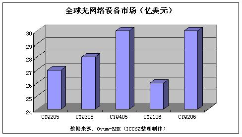 2006年8月16日,Ovum-RHK公司今天公布了2006年第二季度光網(wǎng)絡(luò)設(shè)備供應(yīng)商的初步分析報告,報告顯示,二季度全球光網(wǎng)絡(luò)設(shè)備銷售收入達到30億美元,光網(wǎng)絡(luò)設(shè)備收入比上一季度增長18%,比去年同期增長11%。