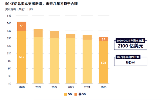 在2021年世界移動(dòng)通信大會(huì)上海展(MWC)期間,GSMA正式發(fā)布的研究報(bào)告《中國(guó)移動(dòng)經(jīng)濟(jì)發(fā)展2021》預(yù)計(jì),2020年至2025年,中國(guó)國(guó)內(nèi)移動(dòng)運(yùn)營(yíng)商將投資近2100億美元來(lái)建設(shè)網(wǎng)絡(luò),其中90%投向5G。