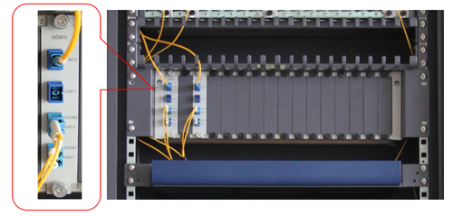 第二種是通過PON Combo板,單板提供GPON和10G PON接口,在2合1連接器上集成了合波器,對外只有一個光接口,這樣在演進時只需要將原有的光接口插入PON Combo板的連接器上就行,該方案的好處是可以根據距離的不同更換光模塊,具有一定的靈活性。