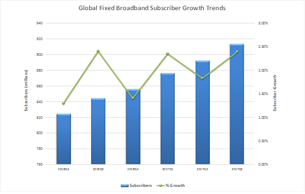 2017年第三季度,全球固定寬帶用戶數增長了2.38%。較第二季度的1.81%有所回升,幾乎與2017年第一季度增長持平。
