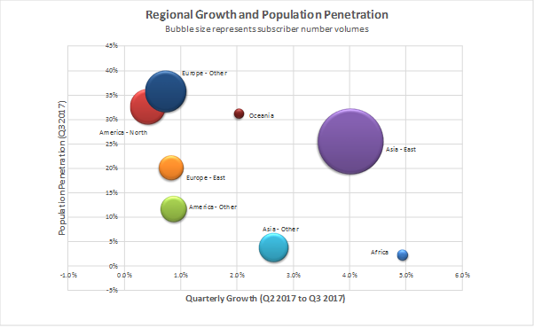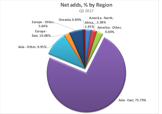 近四分之三的寬帶凈增用戶來自東亞。這主要是受中國的持續(xù)增長推動的,中國Q317新增了1500萬寬帶用戶。