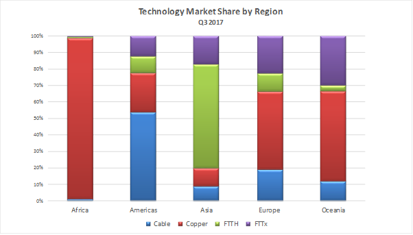 在所有地區(qū),以Copper為基礎的技術(DSL、ADSL和ADSL2+)的份額繼續(xù)下降。在2017年第三季度,大洋洲和歐洲的下降尤為明顯,FTTH和FTTx(包括VDSL)繼續(xù)獲得更多的支持。