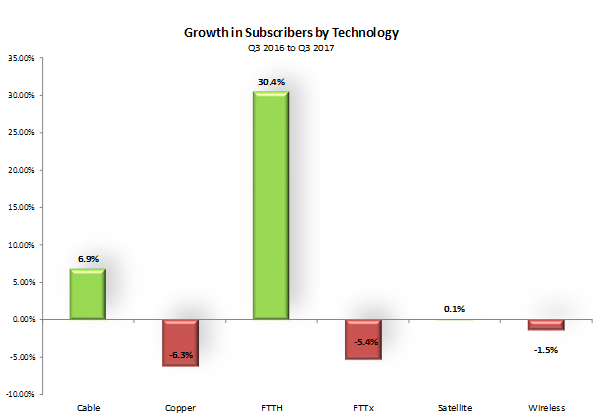 全球Copper下降了6.3%。而FTTH從2016年第三季度到2017年第三季度之間增長了30.4%。
