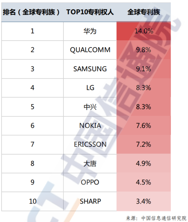 除華為位居榜首外,高通排在第二位,其占比為 9.8%;三星排在第三位,占比為 9.1%;排名第四至第十位的企業(yè)依次是 LG(8.3%)、中興(8.3%)、諾基亞(7.6%)、愛(ài)立信(7.2%)、大唐(4.9%)、OPPO(4.5%) 和夏普(3.4%)。
