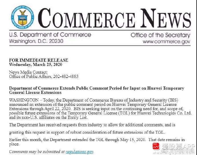 ICC訊 當?shù)貢r間3月25日,美國商務(wù)部工業(yè)與安全局宣布,將對延長華為公司的臨時通用許可證(TGL)一事進行的公開意見征詢的期限延至4月22日。此前商務(wù)部公布的意見征詢期為3月10日至25日。商務(wù)部在一份聲明中說,工業(yè)與安全局正就華為及其在實體名單上的非美國附屬公司的臨時通用許可證的持續(xù)需求和未來可能延長的范圍征求建議。該部門已收到業(yè)界允許提出更多意見的請求,并予以批準,以便對臨時通用許可證的未來延長情況進行“有力的考慮”。聲明說,本月初,美國商務(wù)部延長華為臨時通用許可證至2020年5月15日,該日期仍然有效。