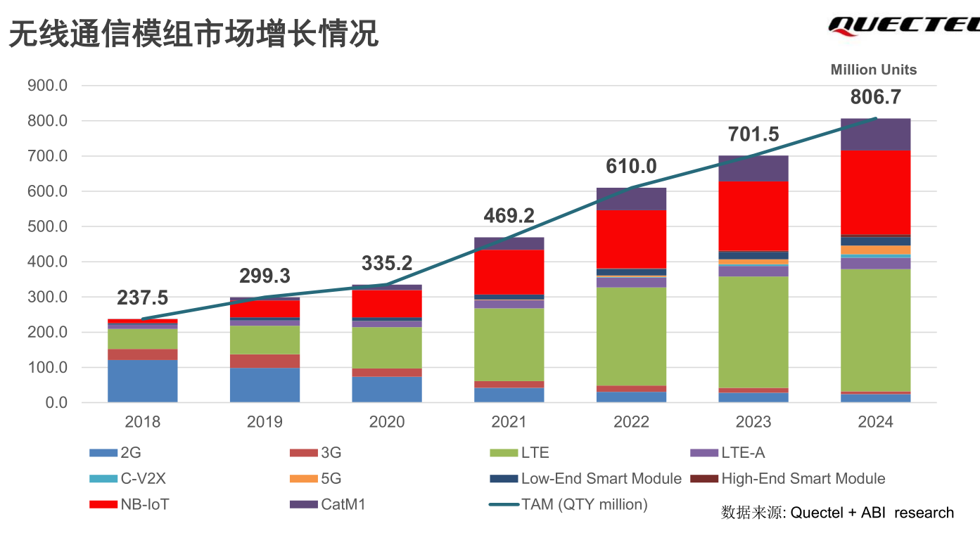 市場的快速發(fā)展需要終端設備廠商有更快速的響應速度,在此過程中,無線通信模組的優(yōu)勢盡顯,包括產(chǎn)品適應性更強、開發(fā)周期更短、總擁有成本更低以及擴展性更好。在5G&AIoT研討會暨移遠新一代產(chǎn)品發(fā)布會上,移遠通信COO張棟援引ABI Research的統(tǒng)計數(shù)據(jù)表示,在物聯(lián)網(wǎng)快速發(fā)展的同時,無線通信模組同樣增長迅猛,2021年全年全球市場無線通信模組的出貨量大約在4.69億片,從2020年到2024年五年間的年復合增長率接近20%,2024年預計將達到8.06億片的規(guī)模。從產(chǎn)品分類來看,LTE和NB-IoT占據(jù)市場主流。