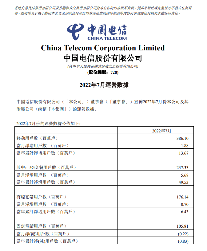 ICC訊 8 月 22 日消息,中國(guó)電信今日公布了 2022 年 7 月運(yùn)營(yíng)數(shù)據(jù),7 月移動(dòng)用戶數(shù) 3.86 億戶,其中 5G 套餐用戶數(shù) 2.37 億戶,當(dāng)月凈增 568 萬(wàn)戶;有線寬帶用戶數(shù) 1.76 億戶;固定電話用戶數(shù) 1.05 億戶。