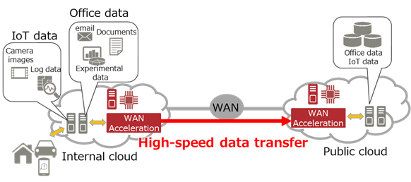 近年來(lái),隨著云的發(fā)展,已經(jīng)有一種提高數(shù)據(jù)和服務(wù)器管理和維護(hù)效率的方法,通過遷移數(shù)據(jù)來(lái)提高數(shù)據(jù)和服務(wù)器管理。此外,如圖所示的傳輸,使用了物聯(lián)網(wǎng)和人工智能等,人們對(duì)工作和業(yè)務(wù)轉(zhuǎn)型中大量數(shù)據(jù)的分析和使用有很高的期望。考慮到這一點(diǎn),在云層之間通過WAN的數(shù)據(jù)量有了爆炸性的增長(zhǎng),這刺激了下一代WAN 加速技術(shù)的需求,這種技術(shù)能夠在云間高速傳輸巨大的數(shù)據(jù)。