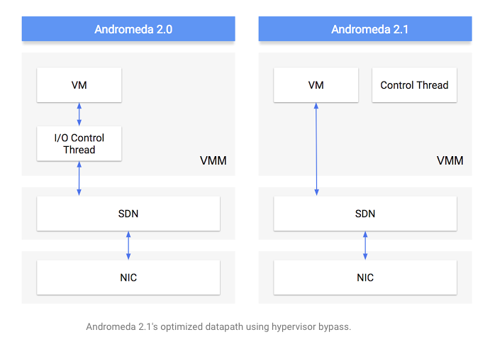 Iccsz訊 谷歌的工程師們近期在其軟件定義網(wǎng)絡(luò)(SDN)平臺(tái)Andromeda上實(shí)現(xiàn)了一種新的降低網(wǎng)絡(luò)延遲的方式,谷歌周四發(fā)布了最新版本的Andromeda 2.1,并表示與Andromeda 2.0相比,谷歌計(jì)算引擎虛擬機(jī)之間的網(wǎng)絡(luò)延遲降低了40%。