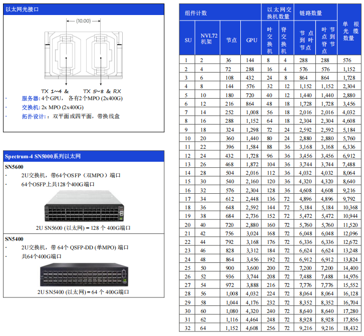 · GPU、葉交換機、脊交換機和超級脊交換機(如適用)之間的連接采用400G MPO-8/12 APC光纜。