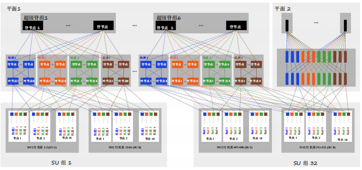 - 每個GPU連接到兩個獨立的平面,以實現(xiàn)負載均衡和冗余。